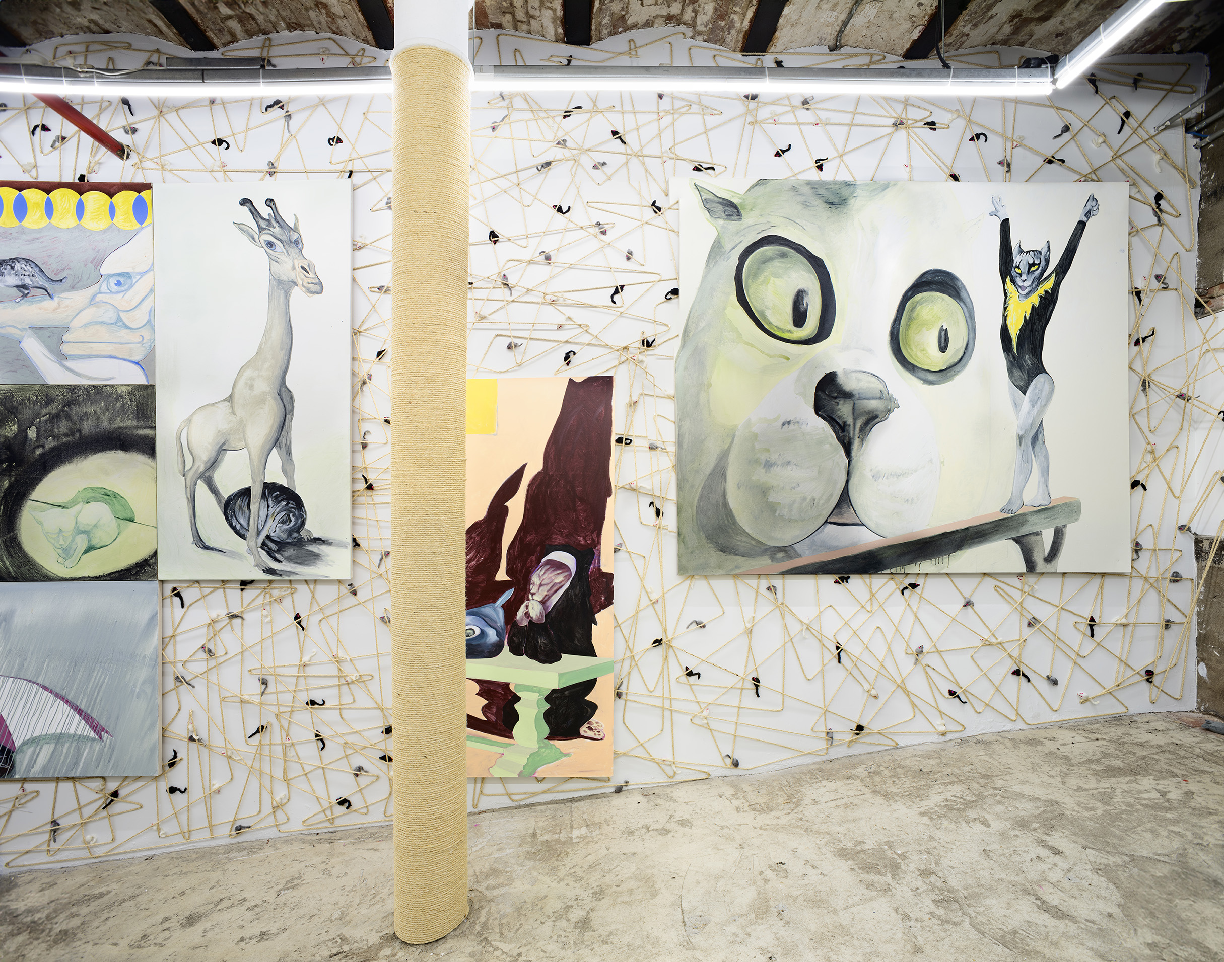 On wretched wings I leave this realm, 2023, acrylic, cat toys, Gremlin costume, cat sweatshirt, and latex cat mask on canvas, 84 x 72 inches