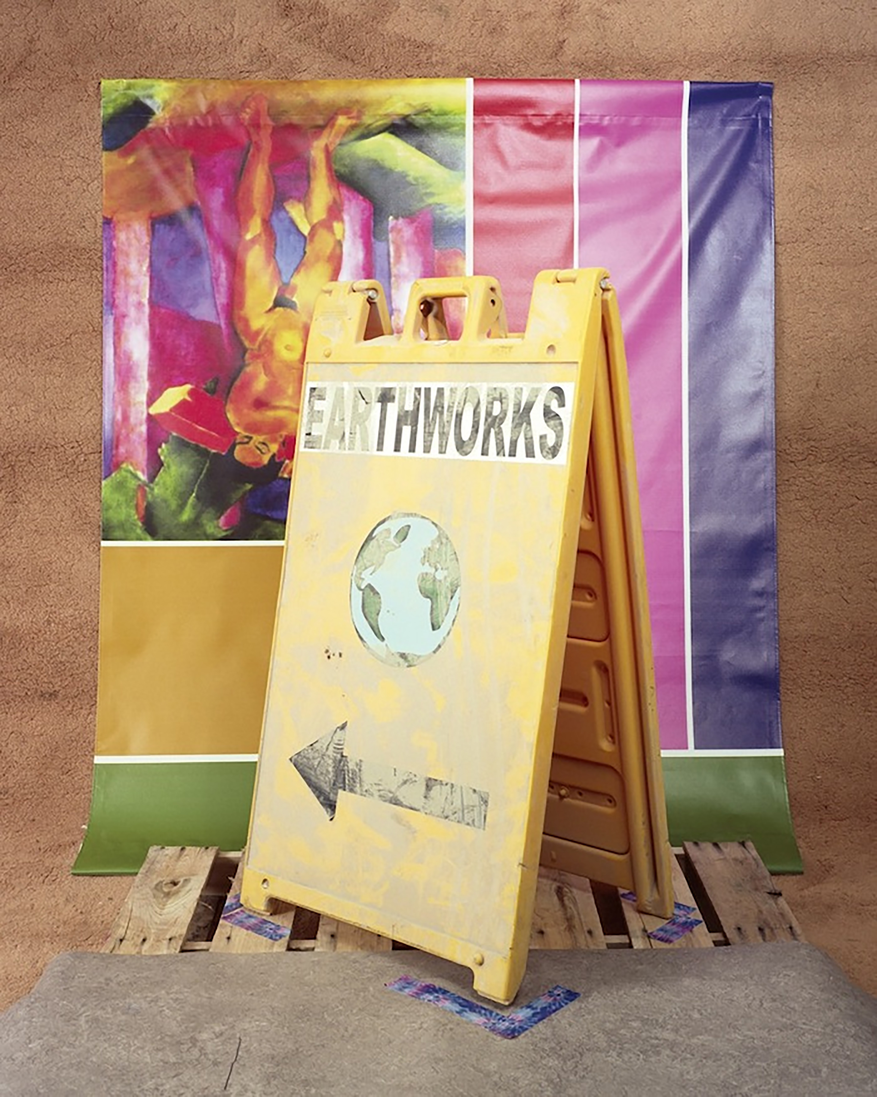 Andy Kincaid, Dream home. Luck wall $$$ (home), 2021Inkjet on billboard vinyl, ladder, paint, arcosanti chime, resor chime, small chime, snake, eBay horseshoe, Fenn’s treasure, horseshoe, silicone, dirt, marshmallow, Christmas wagon, atlas moth, rabbits foot