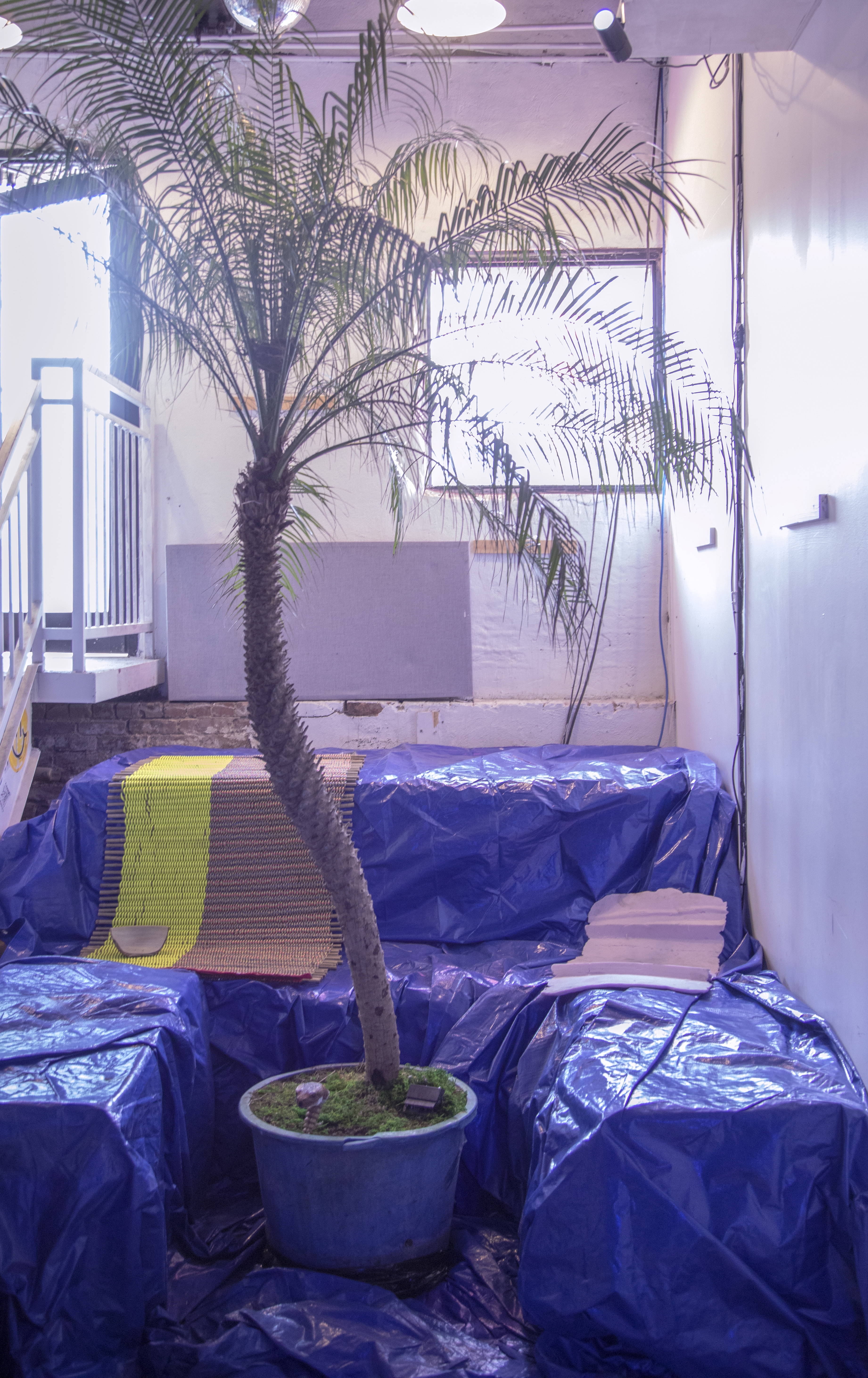 Andy Kincaid, Dream home. MVDR wall on island time [installation view in Newtown Radio], 2021palm tree, birds nest, model cabin, model snake (shortened), silicone, uranium ghost town pottery shard, paracord, bamboo, tape thread