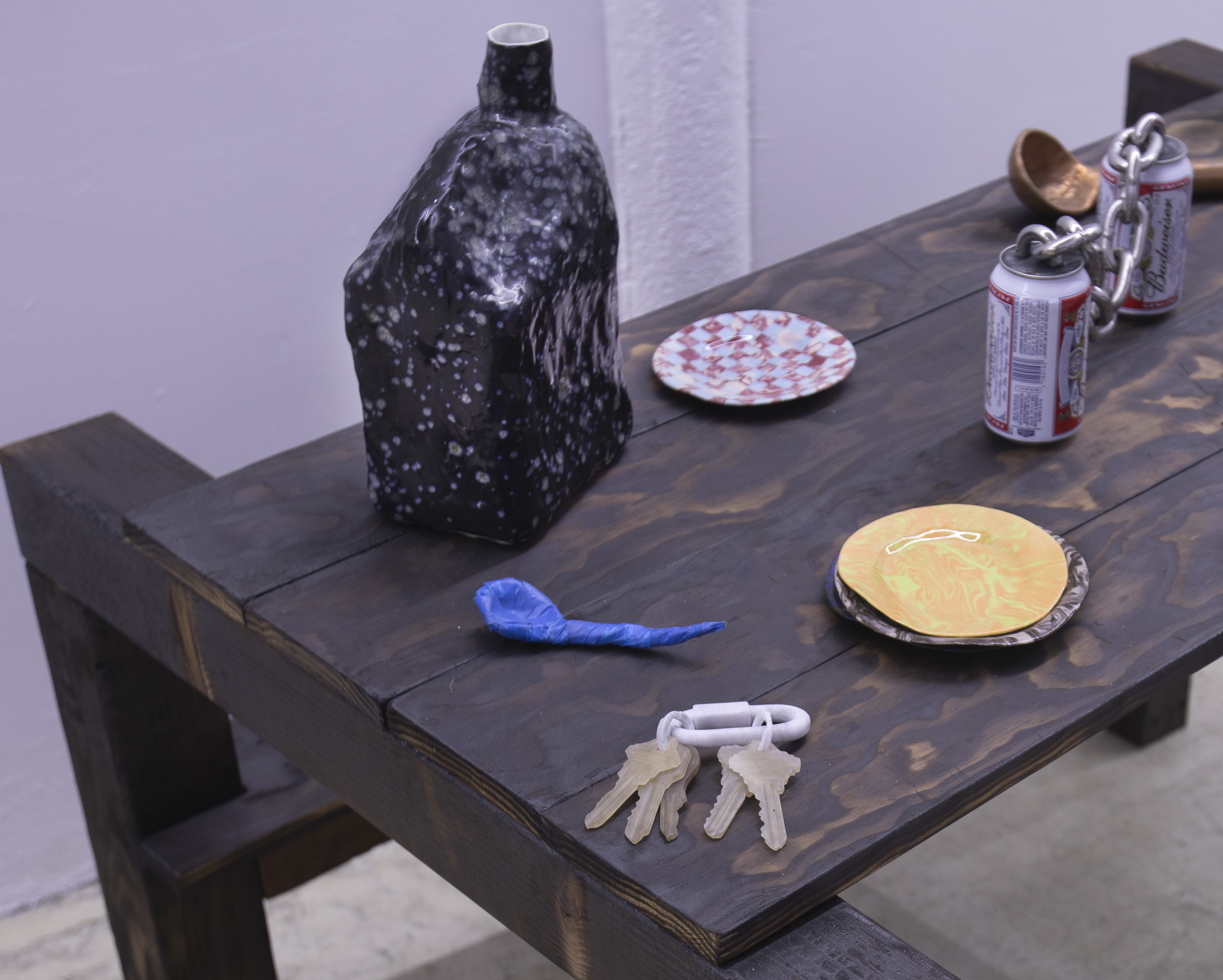 From left to right: Chen Chen & Kai Williams, Cement filled Budweiser nunchucks, 2011, Budweiser, cement, chain; Max Lamb, Nanocrystalline Copper Utensils, 2010, copper; Walter Mingledorf, plates for poison apples, 2021, lead; Imaan Saatr, magic tape vase, 2020, tape