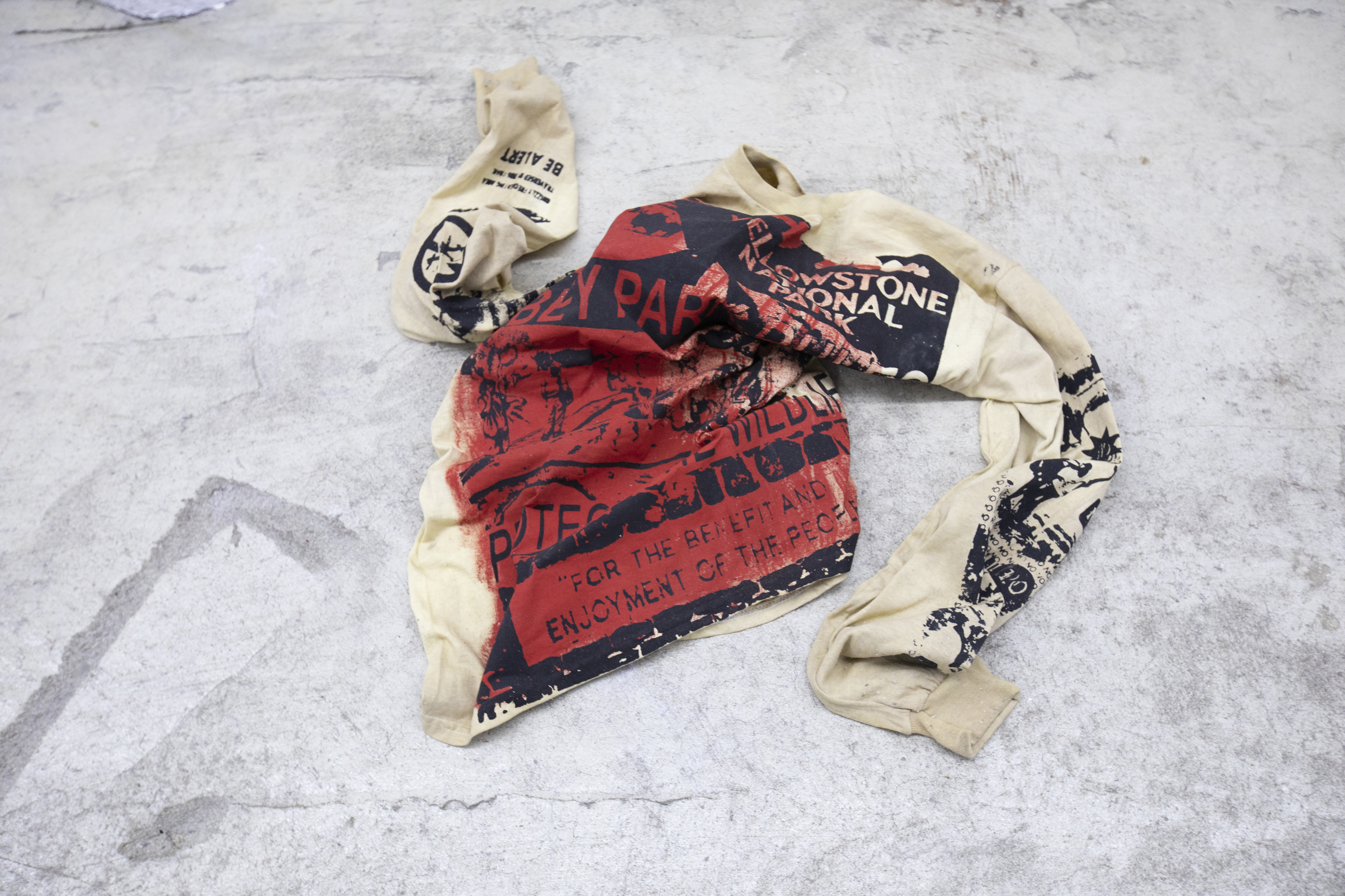 Anoushe’ Shojae-Chaghorvand, BAD BEHAVIOR, 2021 acrylic silkscreen ink, cotton shirt, RIT dye